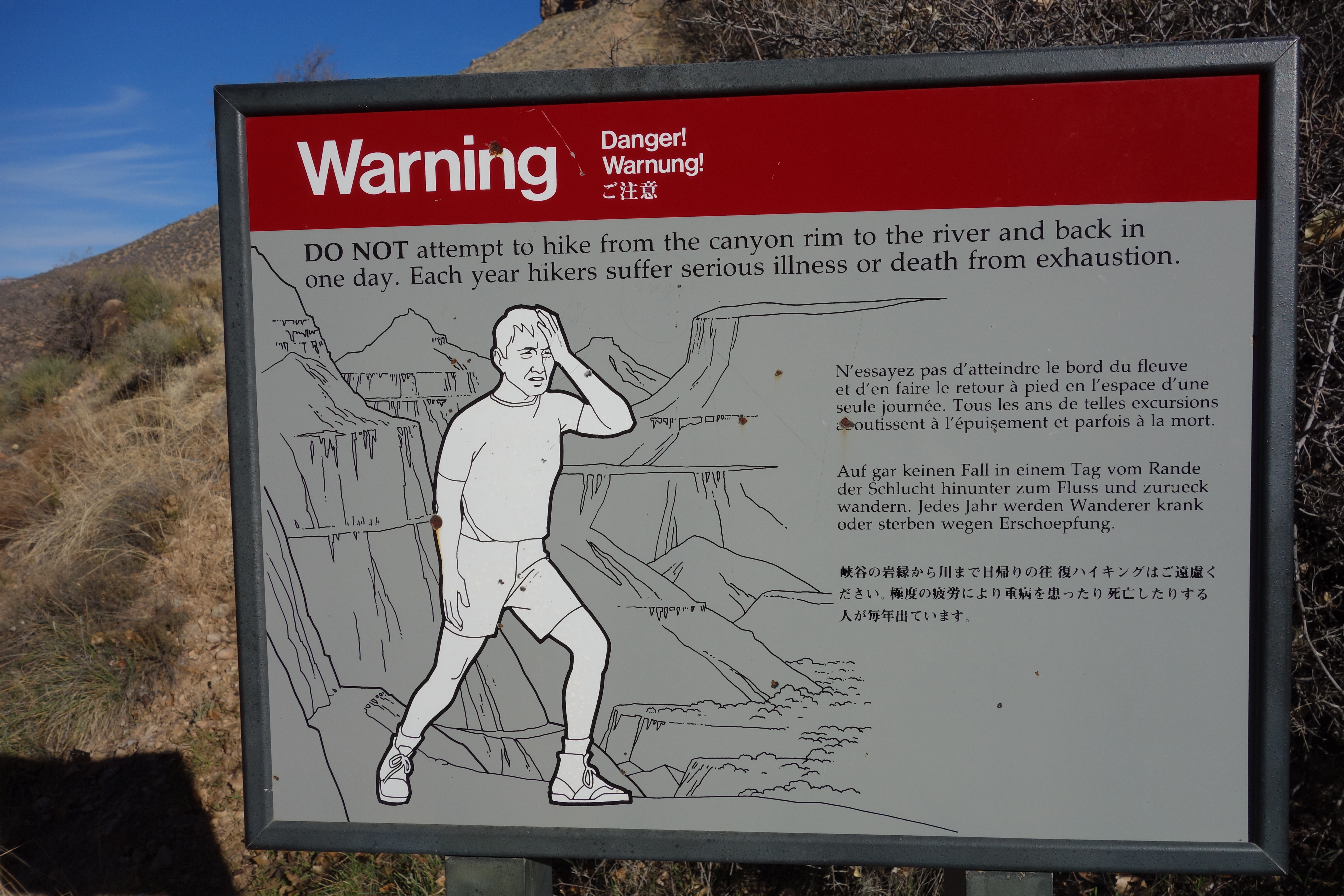 Igår var en lång dag! Vi hade dagen innan kört till södra Grand Canyon och vi gick upp tidigt för att göra en hike från toppen till botten och tillbaka. Det är 1500 m i höjdmeter ner till botten så det är inte helt lätt. Så här tycker parken om det: